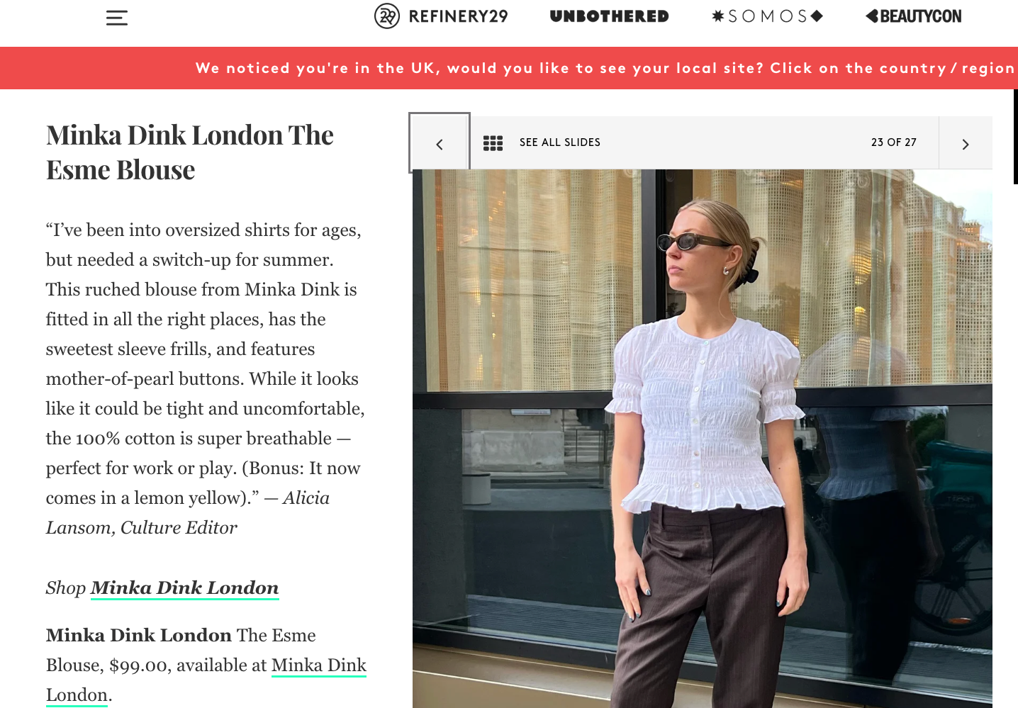 Press love for Minka Dink has grown organically alongside the brand itself. What began as a lockdown side project - with founder Minnie Royden hand-sewing pieces from home - has evolved into a London label that editors genuinely connect with. Rooted in the belief that great clothing can boost confidence and make everyday dressing effortless, Minka Dink’s timeless, versatile pieces have become go-to staples for those in the know. The growing momentum feels natural - a reflection of the brand’s genuine story, its London roots, and designs women truly live in.